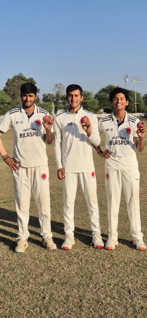 बिलासपुर की गेंदबाज़ी में सक्षम चौबे ने 3 विकेट झटके, अयान उपाध्याय को 2 सफलता मिली, जबकि धनंजय नायक और आदित्य ने 1-1 विकेट हासिल किया।