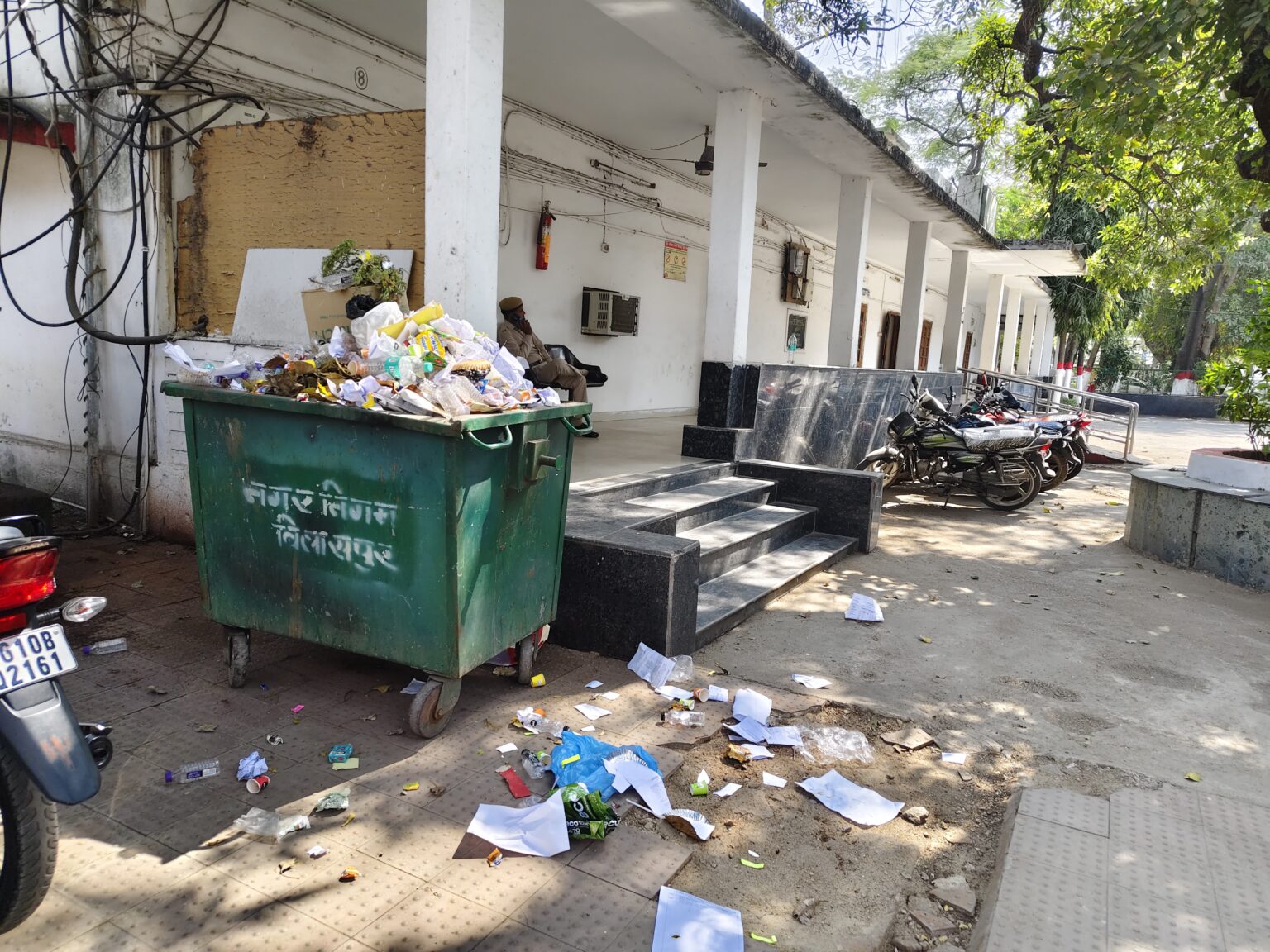 कलेक्टर चैंबर से महज 10 मीटर की दूरी पर रखा एक डस्टबिन मानो अपनी सीमा से आज़ादी की घोषणा कर चुका है। डस्टबिन अब डस्टबिन कम और कचरा वितरण केंद्र ज्यादा प्रतीत हो रहा है। फर्श पर कचरा ऐसे उगल रहा है जैसे उसे भी ‘स्मार्ट सिटी’ की उपलब्धि में योगदान देना हो।