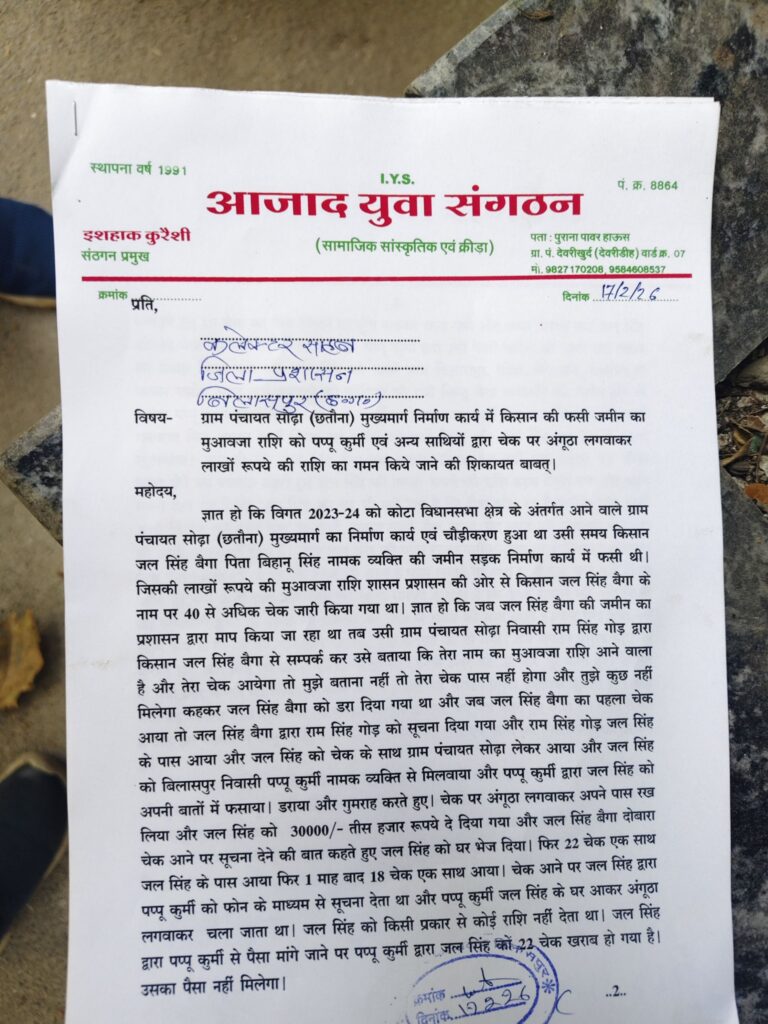सकरी तहसील के ग्राम कोपरा में तालाब निर्माण के लिए स्वीकृत खसरा नंबर 81 और 82 पर अवैध खेती का आरोप। ग्रामीणों का कहना—पहले भी रोका गया, फिर जुताई शुरू। एसडीओ तखतपुर को जांच सौंपी गई।