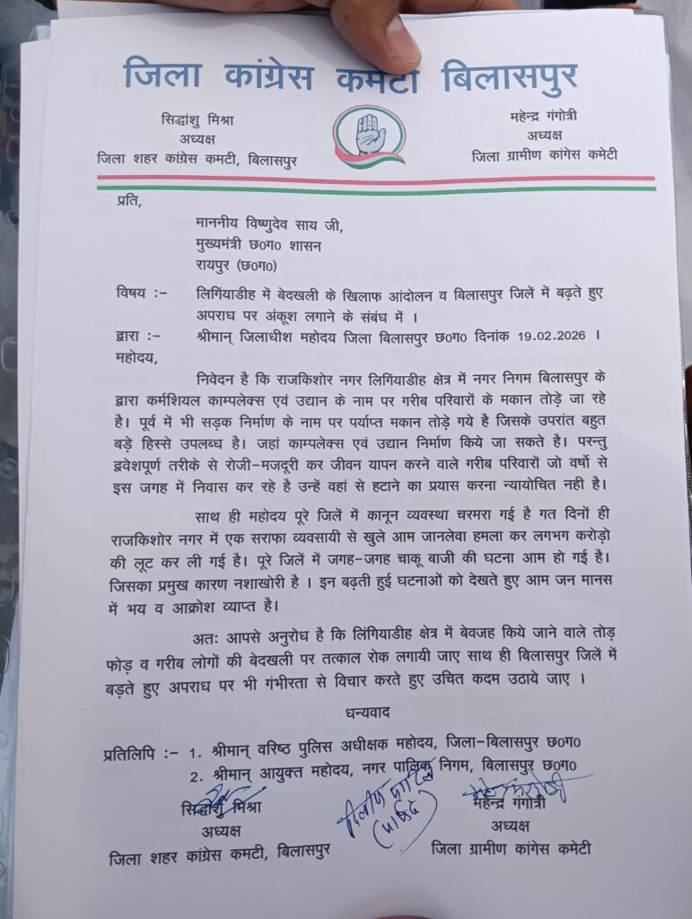 लिंगियाडीह में प्रस्तावित कमर्शियल कॉम्प्लेक्स और उद्यान निर्माण को लेकर सियासत गरमा गई है। जिला कांग्रेस कमेटी ने आरोप लगाया है कि नगर निगम बिलासपुर गरीब परिवारों को उजाड़ने पर आमादा है। जिला शहर कांग्रेस कमेटी के अध्यक्ष सिद्धांशु मिश्रा और जिला ग्रामीण कांग्रेस कमेटी के अध्यक्ष महेन्द्र गंगोत्री ने मुख्यमंत्री विष्णु देव साय को संबोधित ज्ञापन जिलाधीश के माध्यम से सौंपा।