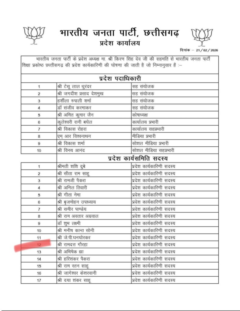 बिलासपुर। भारतीय जनता पार्टी संगठन में सक्रिय भूमिका निभा रहे वरिष्ठ कार्यकर्ता को प्रदेश स्तर पर महत्वपूर्ण दायित्व सौंपा गया है। विगत तीन वर्षों से भाजपा के सदस्य के रूप में कार्य कर रहे और पूर्व में तृतीय वर्ग कर्मचारी संघ बिल्हा के 23 वर्षों तक अध्यक्ष रह चुके पदाधिकारी को प्रदेश भाजपा शिक्षा प्रकोष्ठ की अनुशंसा पर रामदत्त गौराहा प्रदेश कार्यकारिणी सदस्य नियुक्त किया गया है।