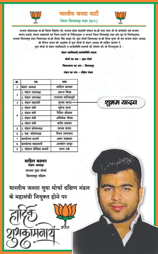 भाजपा बिलासपुर शहर जिलाध्यक्ष दीपक सिंह ठाकुर, युवा मोर्चा जिलाध्यक्ष वैभव गुप्ता एवं मंडल अध्यक्ष शैलेन्द्र यादव की अनुशंसा पर युवा मोर्चा दक्षिण मंडल के अध्यक्ष साहिल कश्यप ने पदाधिकारियों और कार्यसमिति सदस्यों की सूची जारी की।