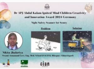 बिलासपुर के स्वामी आत्मानंद शासकीय अंग्रेजी माध्यम स्कूल धुरीपारा की छात्रा निकिता झलारिया ने अपनी नवाचारी सोच से राष्ट्रीय स्तर पर पहचान बनाई है। निकिता को अहमदाबाद की संस्था ‘ज्ञान’ द्वारा आयोजित नवाचार प्रतियोगिता में एपीजे अब्दुल कलाम इग्नाइटेड माइंड अवॉर्ड से सम्मानित किया गया। उन्होंने स्कूटी के लिए ‘नाइट सेफ्टी स्कैनर’ का मॉडल प्रस्तुत किया था।