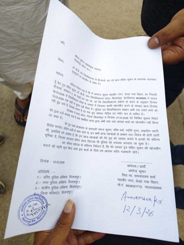 बिलासपुर। कोटा स्थित Dr. C. V. Raman University से बी-फार्मा के एक छात्र की रहस्यमय गुमशुदगी ने विश्वविद्यालय परिसर की सुरक्षा व्यवस्था और प्रशासनिक जिम्मेदारी पर गंभीर सवाल खड़े कर दिए हैं। सेमेस्टर-3 का छात्र रोहित कुमार पिछले छह दिनों से लापता है और अब तक उसका कोई पता नहीं चल पाया है। छात्र के परिजन गुरुवार को बिलासपुर पहुंचे और पुलिस अधीक्षक कार्यालय में शिकायत देकर पूरे मामले में विश्वविद्यालय प्रबंधन पर गंभीर लापरवाही के आरोप लगाए।
