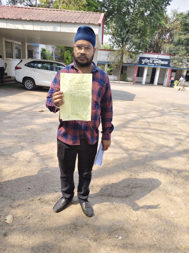 पीड़ित ने इस मामले की शिकायत पुलिस अधीक्षक बिलासपुर को सौंपते हुए थाना प्रभारी के खिलाफ कड़ी कार्रवाई की मांग की है। साथ ही इस शिकायत की प्रतिलिपि पुलिस महानिरीक्षक, नगर पुलिस अधीक्षक चकरभाठा और सिख समाज रायपुर को भी भेजी गई है।