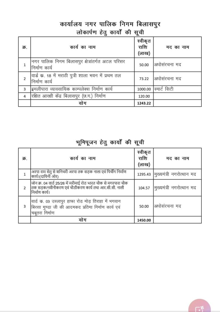 लोकार्पण और भूमिपूजन दोनों को मिलाकर बिलासपुर में कुल 2693.22 लाख रुपए के विकास कार्य निर्धारित किए गए हैं। इनमें अधोसंरचना, स्मार्ट सिटी और मुख्यमंत्री नगरोत्थान मद के तहत विभिन्न परियोजनाएं शामिल हैं, जो शहर के अलग-अलग वार्डों और क्षेत्रों में क्रियान्वित होंगी।