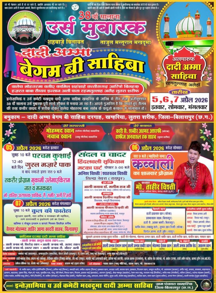जिला बिलासपुर के लुतरा शरीफ स्थित खम्हरिया में अलमारूफ दादी अम्मा बेगम बी साहिबा (रहमतुल्लाह अलैहा) का 38वां सालाना उर्स मुबारक 5, 6 और 7 अप्रैल 2026 (रविवार, सोमवार, मंगलवार) को अकीदत और एहतराम के साथ मनाया जाएगा। उर्स का आयोजन इंतेजामिया व उर्स कमेटी मखदूमा दादी अम्मा साहिबा, खम्हरिया की ओर से किया जा रहा है। उर्स कार्यक्रम के मुख्य अतिथि छत्तीसगढ़ वक्फ बोर्ड के अध्यक्ष डॉक्टर सलीम राज होंगे।