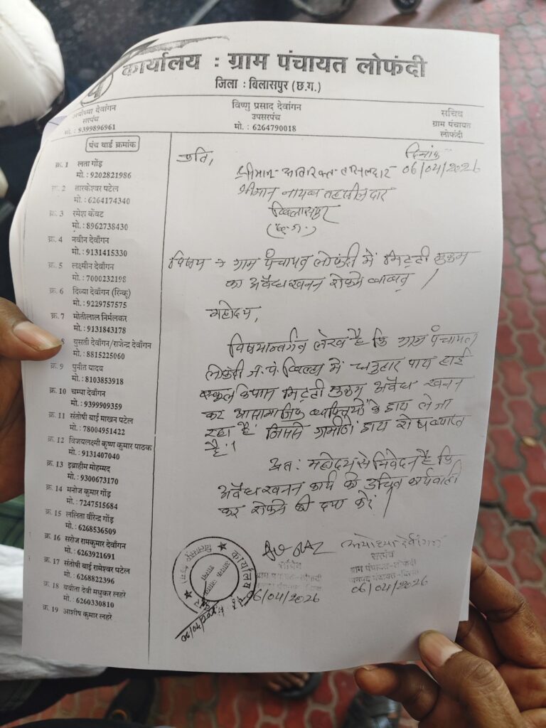 ग्राम पंचायत लोफंदी के सरपंच अयोध्या देवांगन ने बताया कि गांव में लगातार मुरूम की चोरी हो रही है और कई बार शिकायत के बावजूद कोई स्थायी समाधान नहीं निकल पाया है।