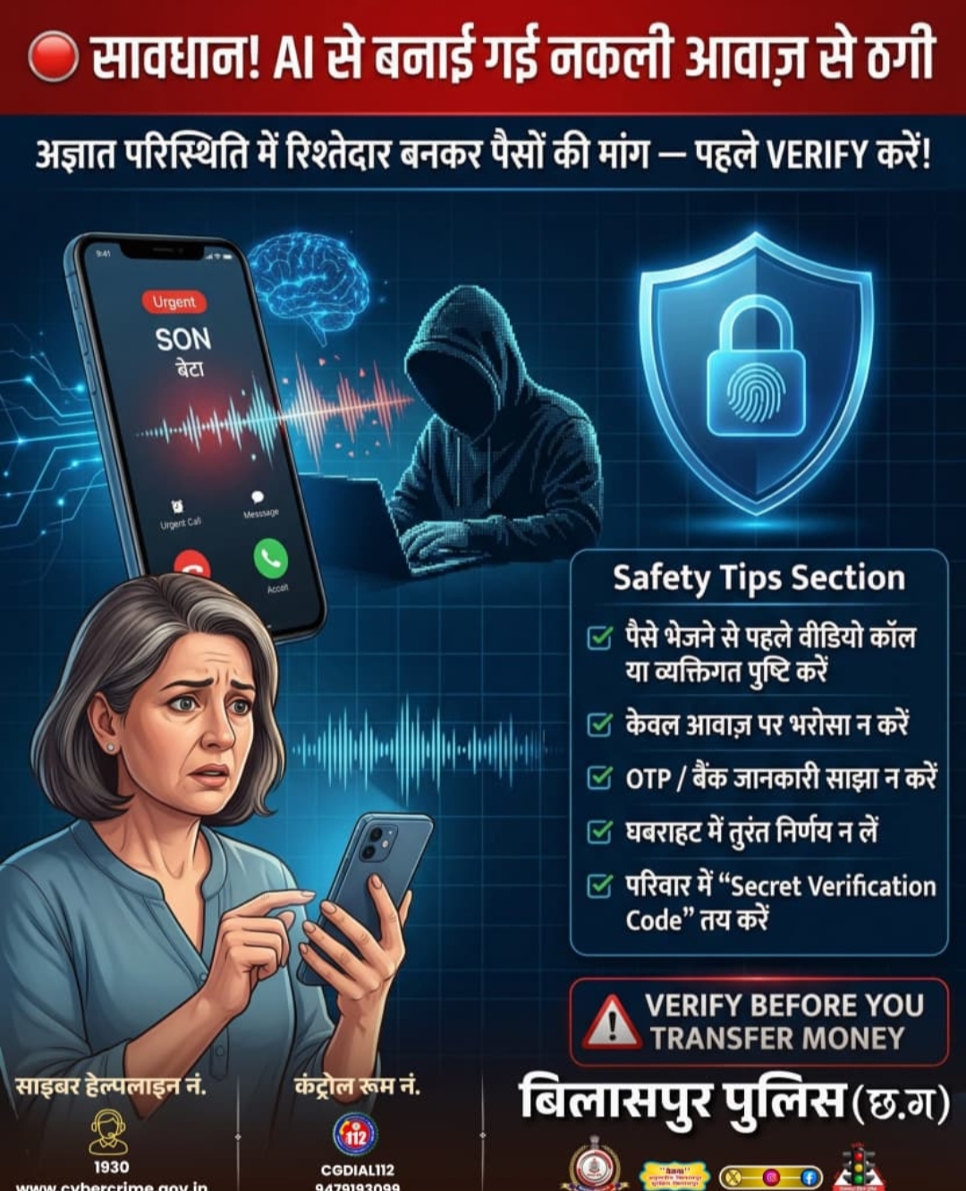 पोस्टर में एक मोबाइल स्क्रीन का चित्रण किया गया है, जिसमें “SON (बेटा)” नाम से आने वाली कॉल दिखाई गई है और उसे “Urgent” बताया गया है। इसके जरिए यह दर्शाया गया है कि अपराधी AI तकनीक से किसी परिचित या परिजन की आवाज़ की नकल कर भरोसा जीतने की कोशिश करते हैं। साथ ही, एक हुडी पहने संदिग्ध व्यक्ति लैपटॉप पर काम करता दिखाया गया है, जो साइबर अपराध के बढ़ते खतरे को संकेत करता है।