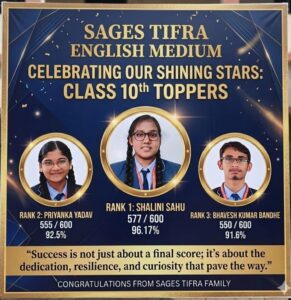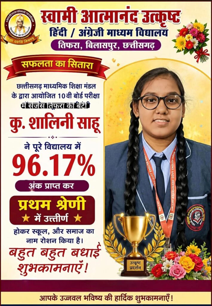 बिलासपुर। छत्तीसगढ़ माध्यमिक शिक्षा मंडल द्वारा कक्षा 10वीं के परीक्षा परिणाम घोषित होते ही स्वामी आत्मानंद उत्कृष्ट अंग्रेजी माध्यम विद्यालय, तिफरा (SAGES Tifra) में खुशी की लहर दौड़ गई। इस वर्ष विद्यालय की छात्रा शालिनी साहू ने 96.17% अंक प्राप्त कर न केवल विद्यालय बल्कि पूरे क्षेत्र का नाम रोशन करते हुए इतिहास रच दिया। वहीं ओम लोधी ने 90% अंकों से 12 वी कक्षा में टापर बने